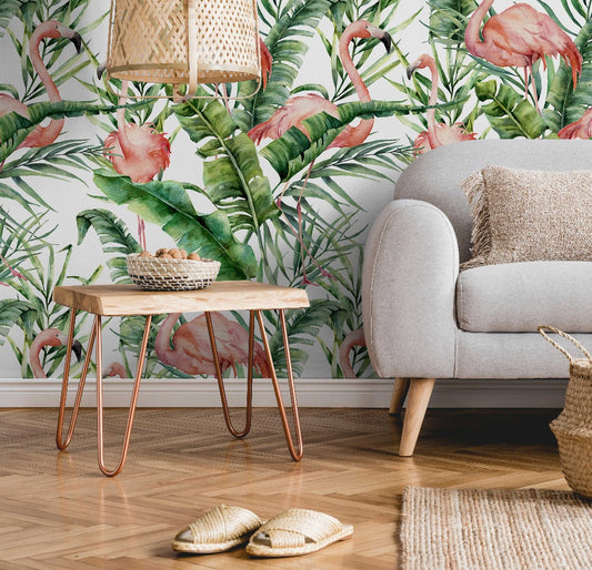 Flamingos and Tropical Leaves Wallpaper Mural