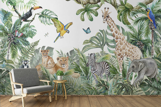 Wild Animals and the Jungle Watercolor Mural Wallpaper