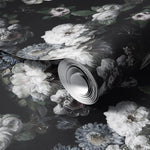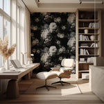 Bring an air of dramatic beauty to your home with the Midnight Bloom Floral Wallpaper Mural. This exquisite design features a stunning arrangement of white peonies, delicate roses, and soft blue blossoms, all set against a deep black background. The elegant contrast creates a mesmerizing centerpiece for any room.